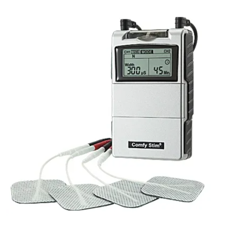 The Comfy Stim®is a combination unit of TENS and EMS. It features 5 TENS modes and 2 EMS modes. The pulse width, pulse rate, ramp time, on time, off time and timer are fully adjustable. The user can identify if it is a TENS or EMS mode by the reading on the top of LCD.